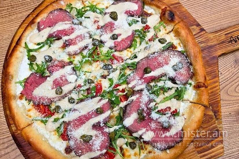 Ростбіф, чері, рукола, соус вітело тонато, каперси, пармезан, вершковий соус.