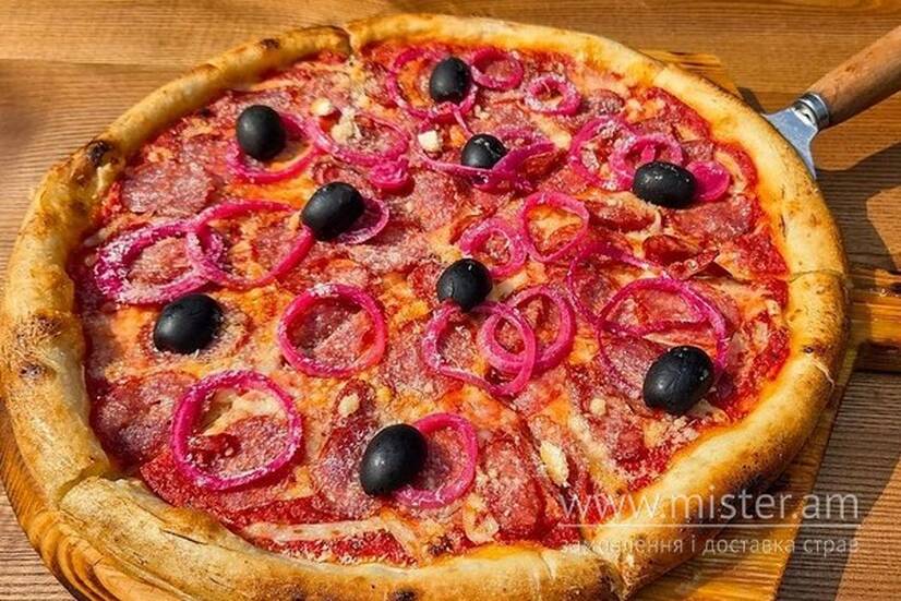 Ковбаски мисливські, салямі, маслини, цибуля маринована, пармезан, моцарела, соус томатний.
