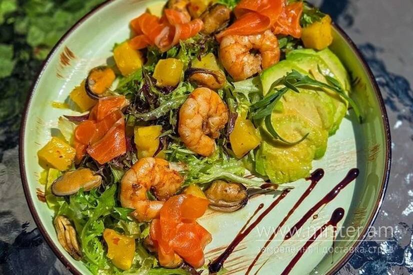 Креветка тигрова, мідіі, лосось копчений, мікс салату, авокадо, манго, цитрусова заправка.