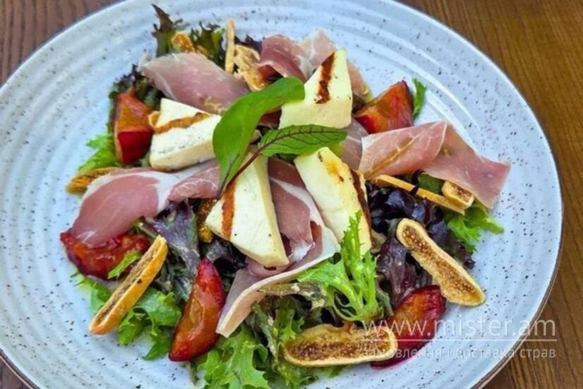 Сир халумі, прошуто, маринована слива, інжир, мікс салату, заправка цитрусова.