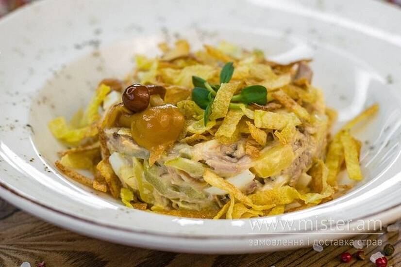 Томлена в смокері рвана яловичина, огірки та опеньки мариновані, картопля відварна, куряче яйце, халапеньйо, хрустка картопля та фірмовий соус.