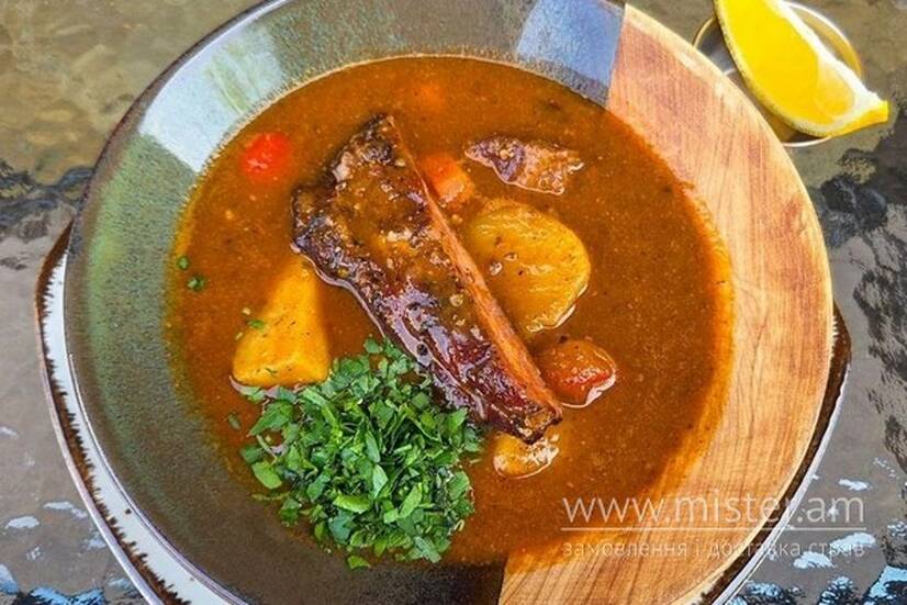 Густий томатний суп з реберцями зі смокеру, телятиною, болгарським перцем та квасолею.