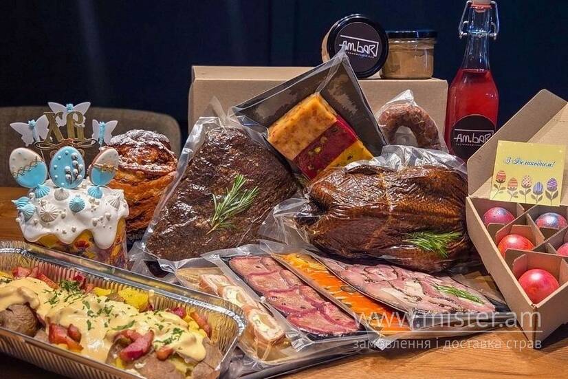 Пасхальні крашанки - 6 од. Рулет курячий з грушею та дорблю - 200 г. Тріо крафтових сирів - 225 г. Філе лосося холодного копчення - 150 г. Язик зі смокеру - 150 г. Буженина зі смокеру - 200 г. Паштет з курячої печінки з ягідним конфі - 200 г (в банці). Паштет з лосося зі смокеру - 200 г (в банці). Підчеревина зі смокеру - 200 г. Ковбаса власного копчення -300 г. Качка зі смокеру - 1 од (з ягідним соусом). Ребра свинячі зі смокеру - 0,5 кг (з соусом BBQ). Картопля запечена в хоспері - 1 кг. Куліч пасхальний традиційний - 300 г. Крафін з маком та вишнею - 350 г. Настоянка власного виробництва (на вибір) - 0,5 л. Пакування.