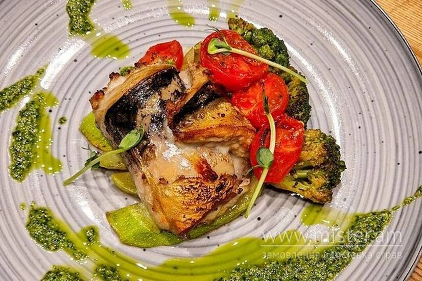Філе скумбрії, моцарела, кабачок, броколі, чері, цитрусовий песто.
