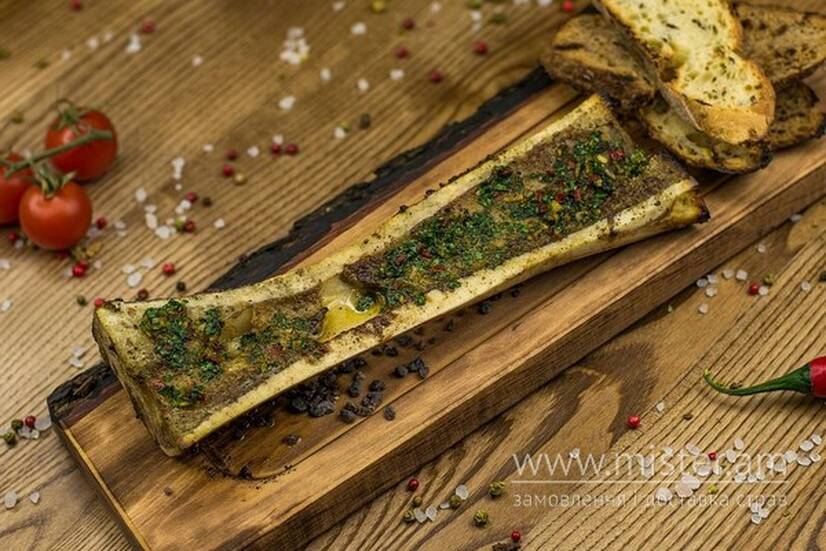 Яловичий кістковий мозок у кістці з соусом чімічурі та хрусткими грінками.