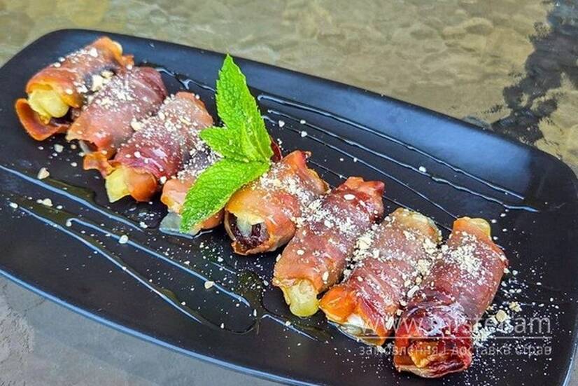 Запечені фініки, фаршировані брі, кешью, обернуті прошуто, мед.