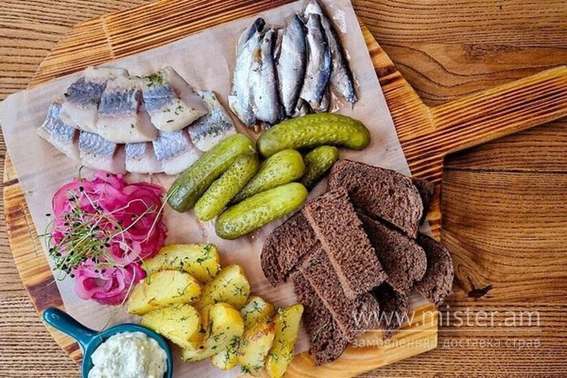 Сет українських закусок до горілки: тюлька, оселедець, солоні огірки, картопля у мундирі, маринована цибуля ,вершковий тар тар, житні грінки.