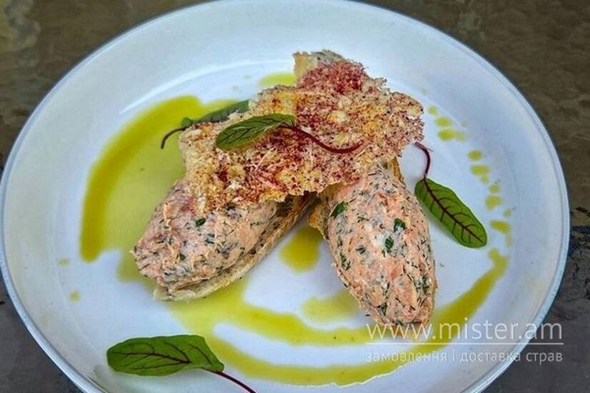 Лосось зі смокеру, крем сир, анчоус, грінки з чіабати, зелень.