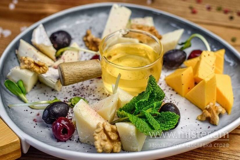 Дор блю, брі, пармезан, чедер, фісташки, оливки, мед.