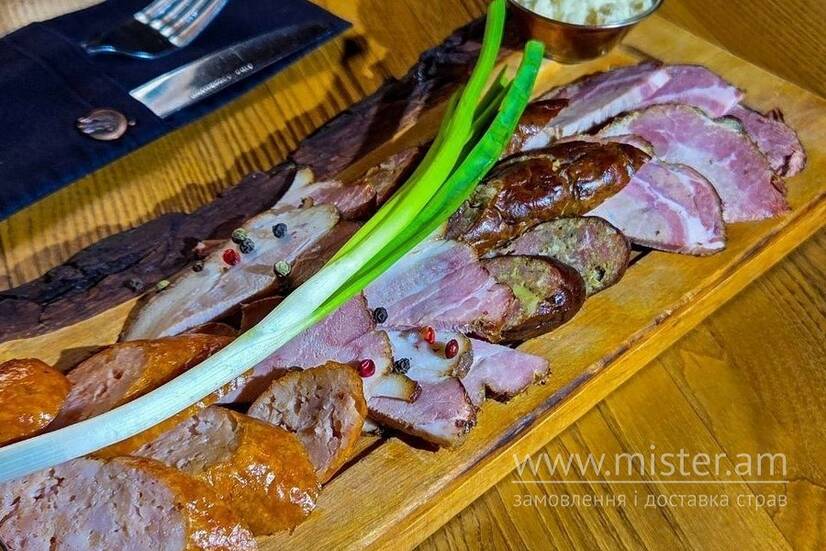 Буженина, ковбаса копчена власного приготування, підчеревина зі смокеру, ковбаса куряча, гірчиця, хрін.