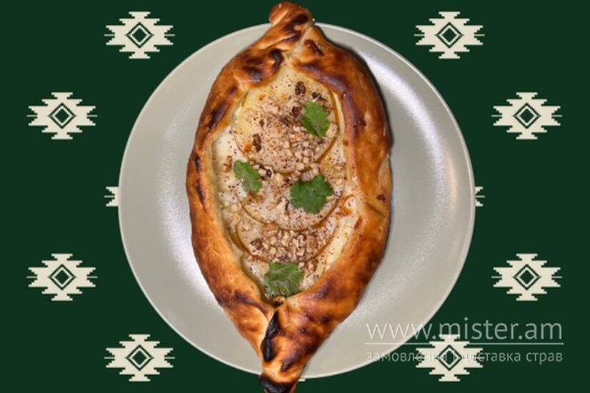 Піца-піде у формі човника з поєднанням ніжного сулугуні, соковитої груші та тонкого тіста — витончена версія класичної страви з легкою солодкою ноткою.