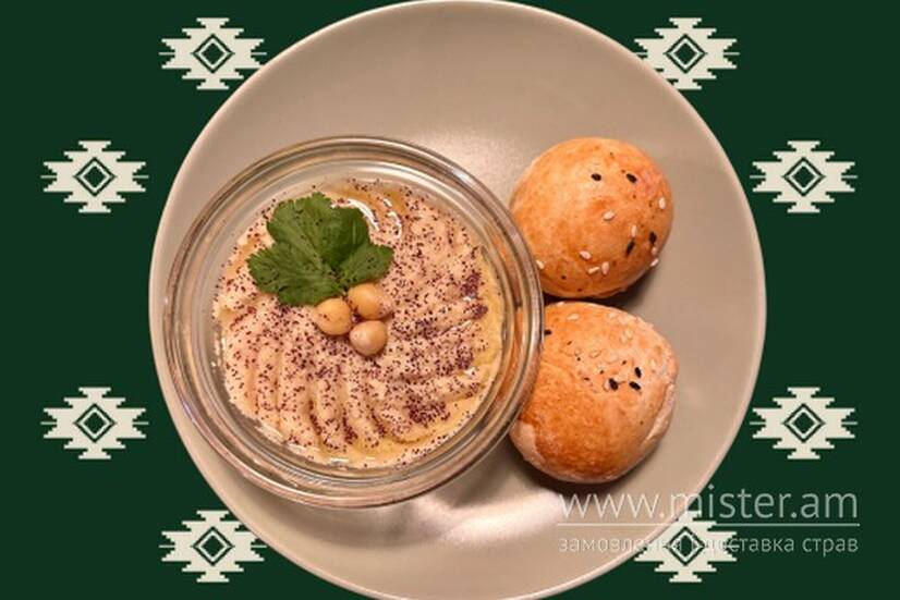 Закуска з нутового пюре, в який входить оливкова олія, сік лимона, часник, паприка та кунжутна паста тахіні. Подаємо з отьмеком (коржиком).