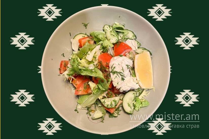 Траційний салат зі свіжих овочів: помідора та огірка, зелені та кримської цибулі.