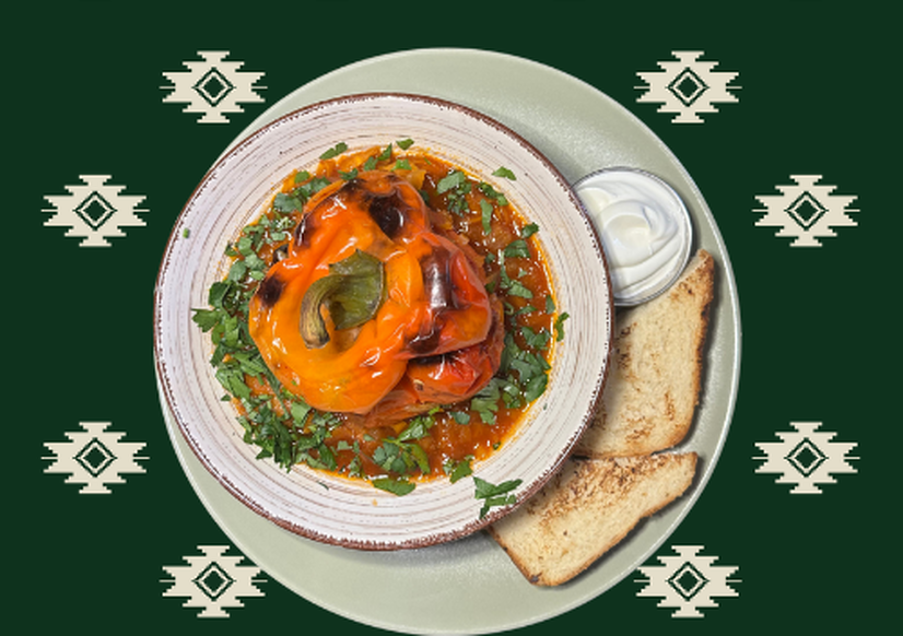 Соковитий болгарський перець, запечений з ніжним фаршем із курятини, телятини та рису, в ароматній томатній підливі. Подаємо з цибулевим хлібом та сметаною.