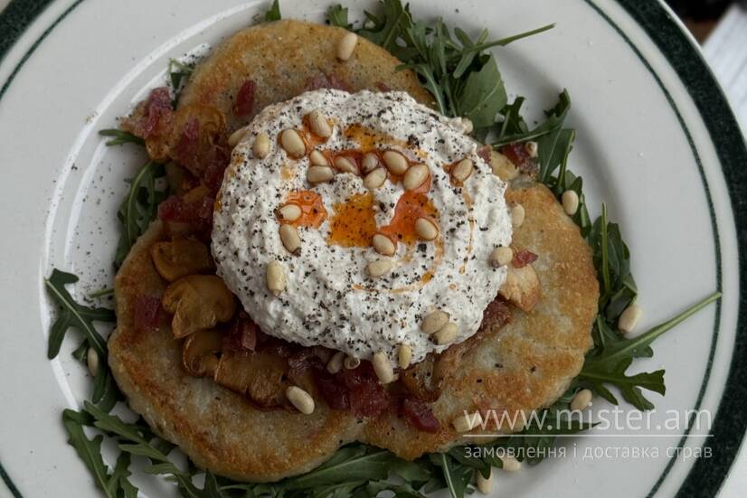 Кармелізованим беконом, руколою, грибним соусом та кедровим горіхом.
