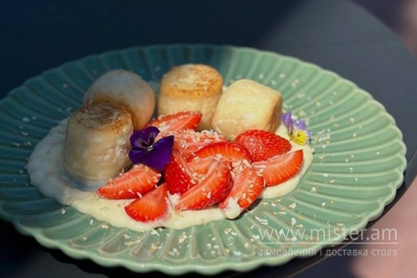 Сирники, заварний крем, кокосова стружка, малинове кюлі, мигдалеві пластівці.
