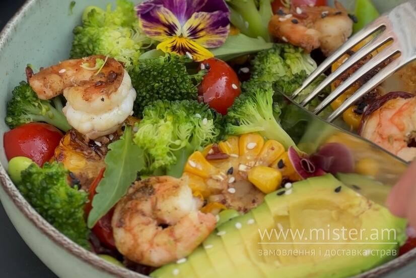 Червоний рис, брокколі, черрі, боби едамаме, креветка тигрова, кунжутна олія, соєвий соус, кунжут, авокадо, кукурудза початок.