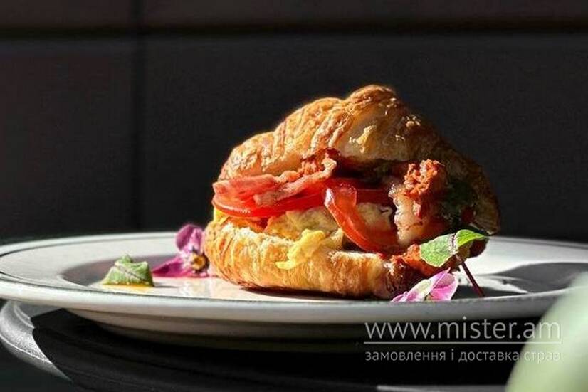 Круасан, скрембл, соус песто, бекон, мус мухамара, помідор.