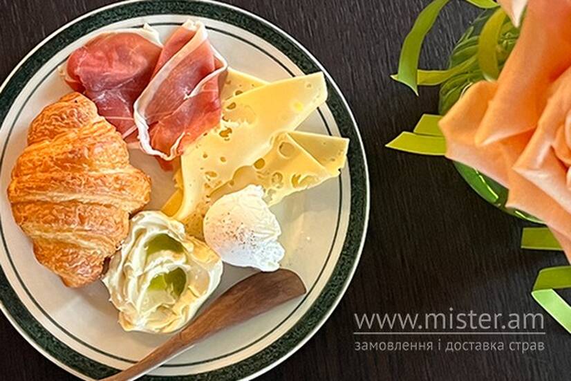Круасан, сир масдам, хамон, яйце, збите трюфельне масло.