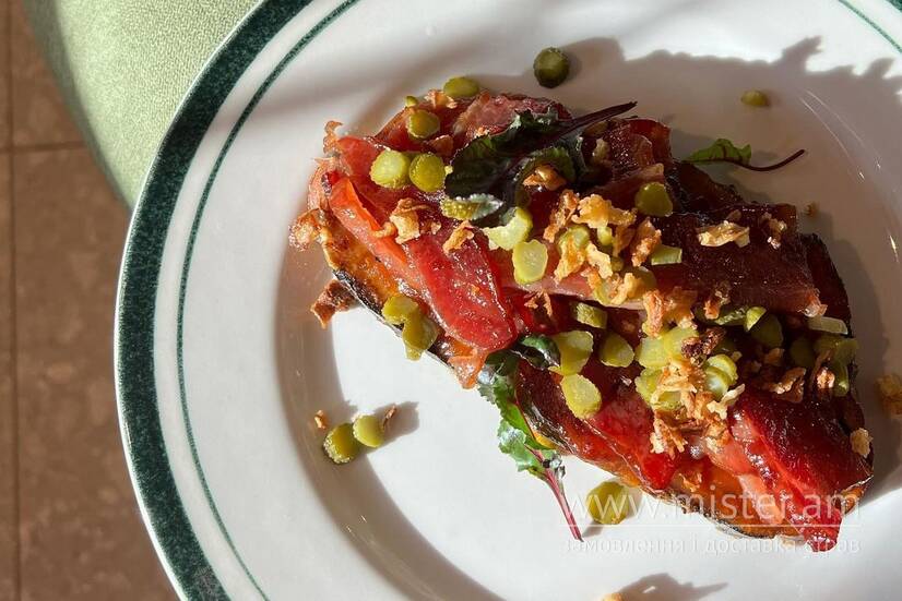 Карамелізований бекон, томатно-кавовий конфітюр, цибулевий кранч, корнішон, тартін з в`яленими томатами та оливками обсмажений в яйці, мус мухамара.