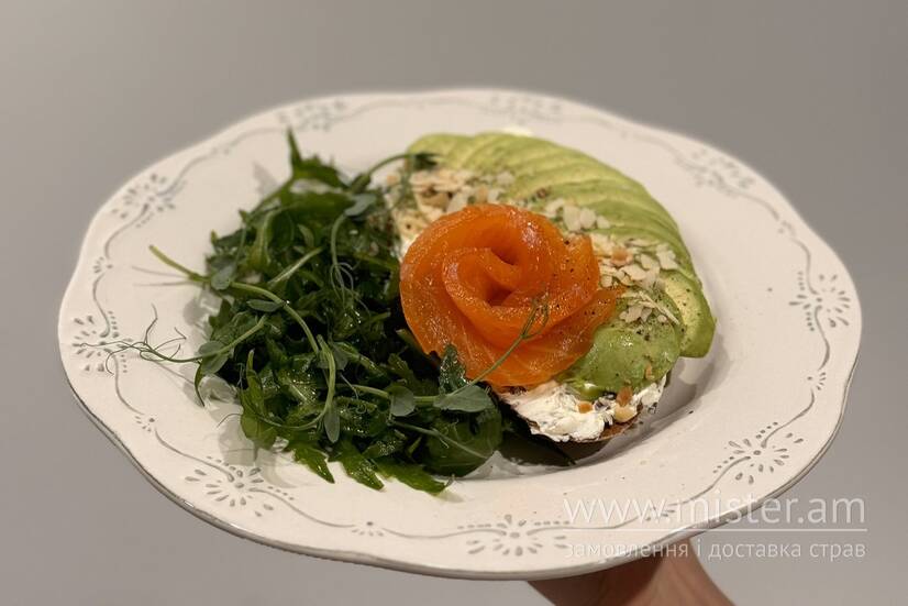 Тартін з в`яленими томатами та оливками, трюфельна паста, крем-сир вершковий, руккола, лосось слабосолений, мигдалеві пластівці.