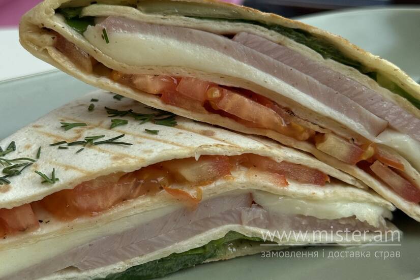 Медово-гірчичний соус, томат, моцарела, салат ромен.