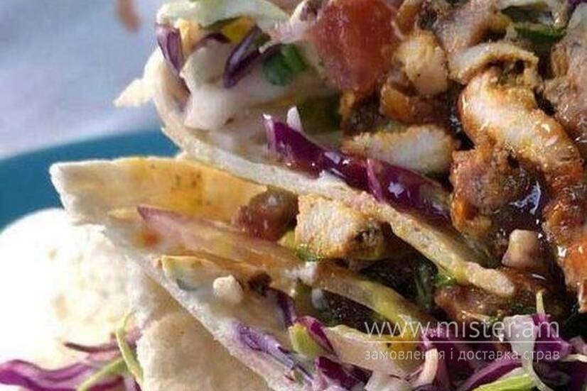 Ніжне куряче м`ясо, свіжий салат (білокачанна, синя, пекінська капуста, лист салату, морква), картопля фрі, соковитий часниковий соус, пухка груба булка.
