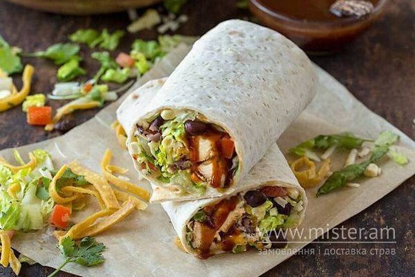 Ніжне куряче м`ясо, свіжий салат (білокачанна, синя, пекінська капуста, лист салату, морква), соковитий часниковий соус, запашна піта.
