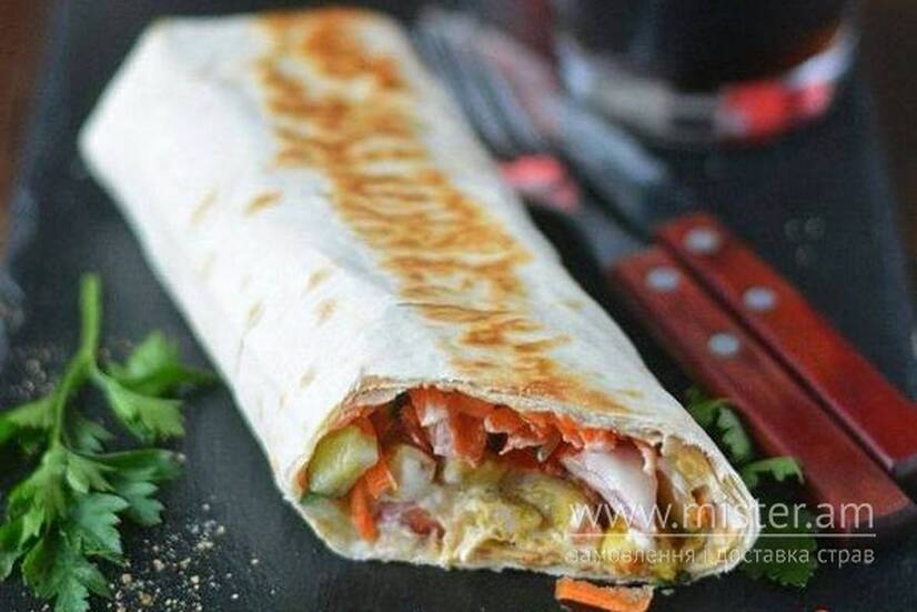 Ніжна яловичина, свіжий салат (білокачанна, синя, пекінська капуста, лист салату, морква), соковитий часниковий соус, запашна піта.