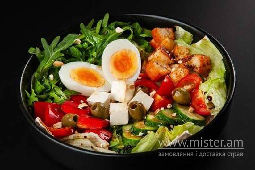 Яйце куряче, сир фета, оливки, свіжий огірок, томати коктельні чері, перець болгарський, айсберг, рукола, крутони, оливкова олія, горішки кеш`ю, соус бальзамічний.