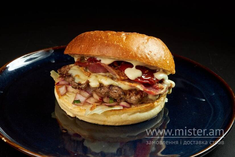 Яловичий біфштекс, булочка бріош, смажений бекон, сир моцарела, в`ялені томати, айсберг, цибуля марс маринована, цибуля кріспі, соус сирний.