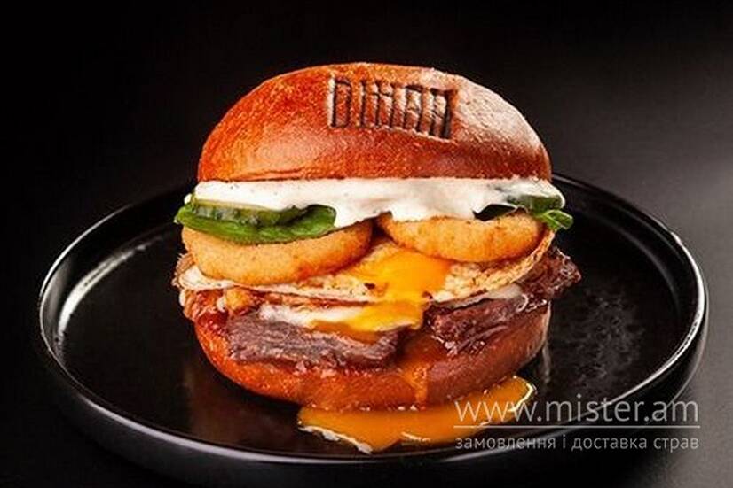 Ніжна яловичина су-від, огірки мариновані пікулі, салат латук, сир моцарела, яйце куряче, кільця цибулі в паніровці, соус барбекю, соус часниковий.