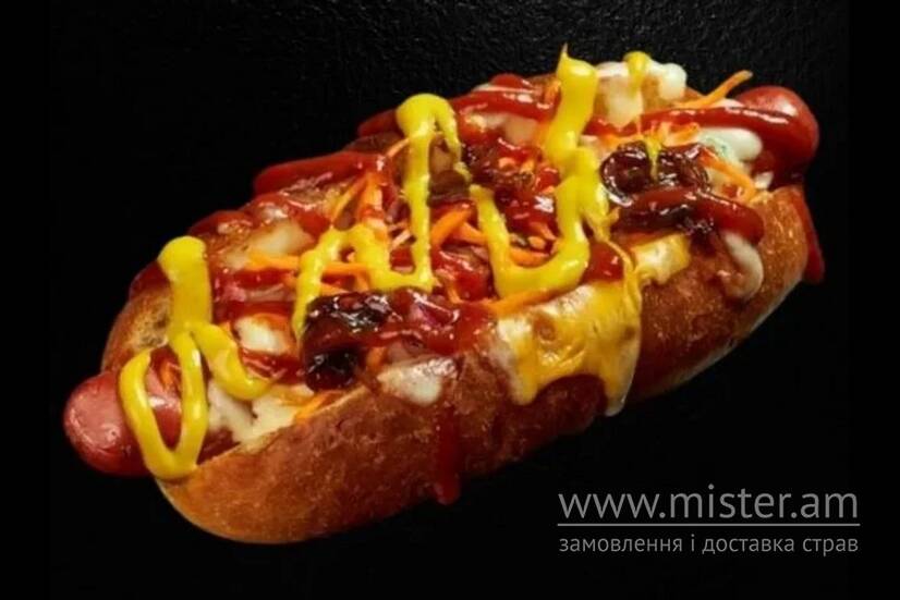 Сосиска баварська, булочка для хот-догу бріош, сир чедер, сир моцарела, карамелізована цибуля, морква по-корейськи, цибуля марс маринована, соус барбекю, лагідна гірчиця, майонез.