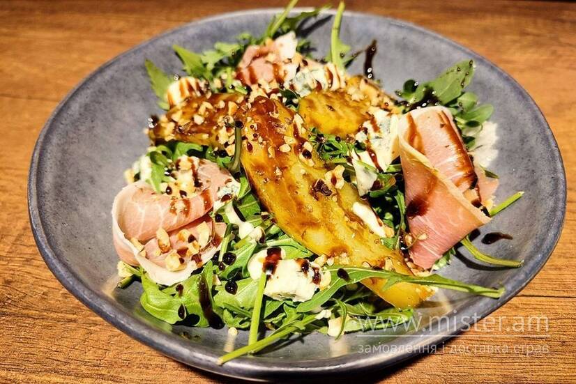 Карамелізована груша, прошуто, рукола, айсберг, сир дор блю, соус сирний, крем бальзамічний, горіх волоський.