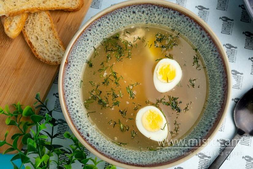 Соковите курча, локшина, перепелине яйце, кріп, крутони.