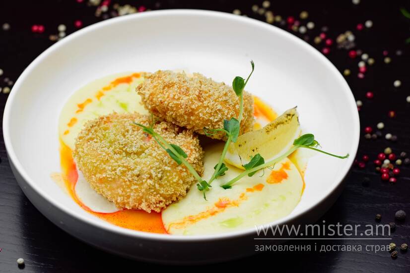 Філе лосося, креветка, сухарі Панко, куряче яйце, пармезанове пюре, соус Берблан, лимон.