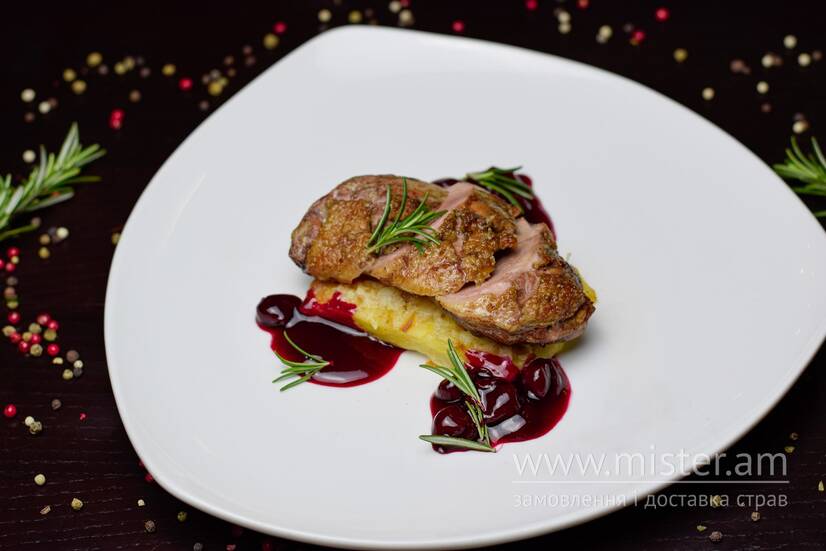 Качине філе, картопляний гратен, вишневий соус, зелена олія.