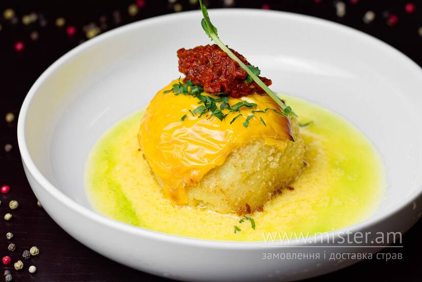 Яловичина рублена, картопля, сухарі Панко, сир Чеддер, соус Айолі, соус Сальса, спеції.