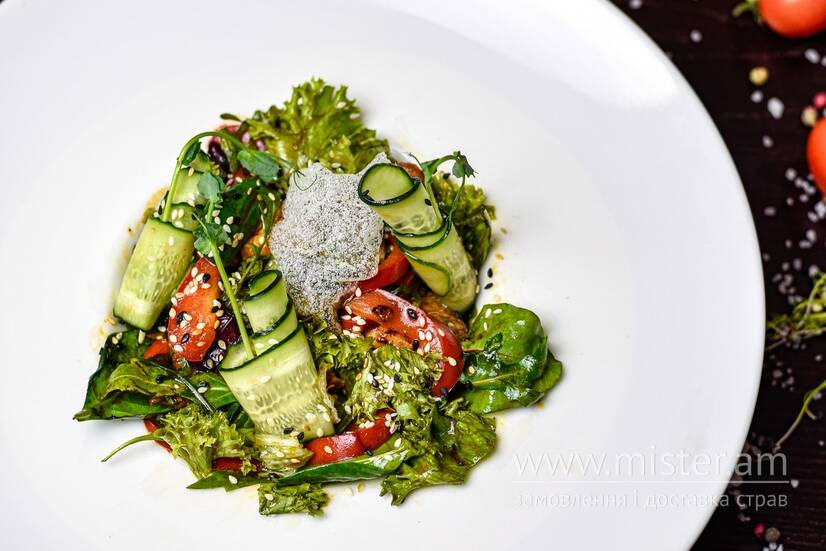 Філе індички, листя салату, перець болгарський, огірок, кунжут, соус Теріякі, олія.