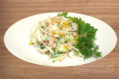Капуста свіжа, огірки свіжі, морква, кукурудза, шинка, зелень.
