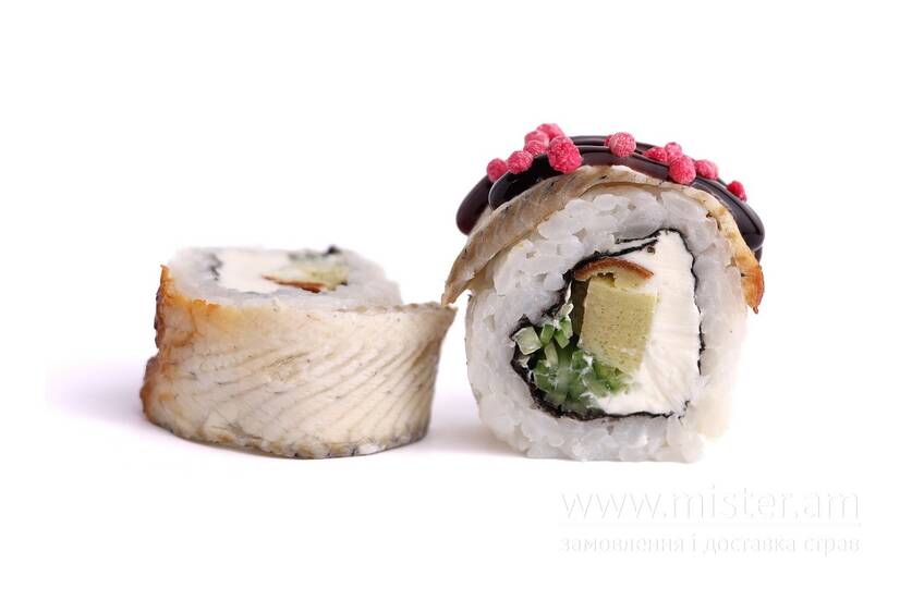 Суші-рис, норі, вершковий крем-сир, японський омлет, огірки, вугор, соус унагі, рисові кульки.