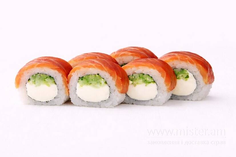 Суші-рис, норі, вершковий крем-сир, огірок, лосось копчений.