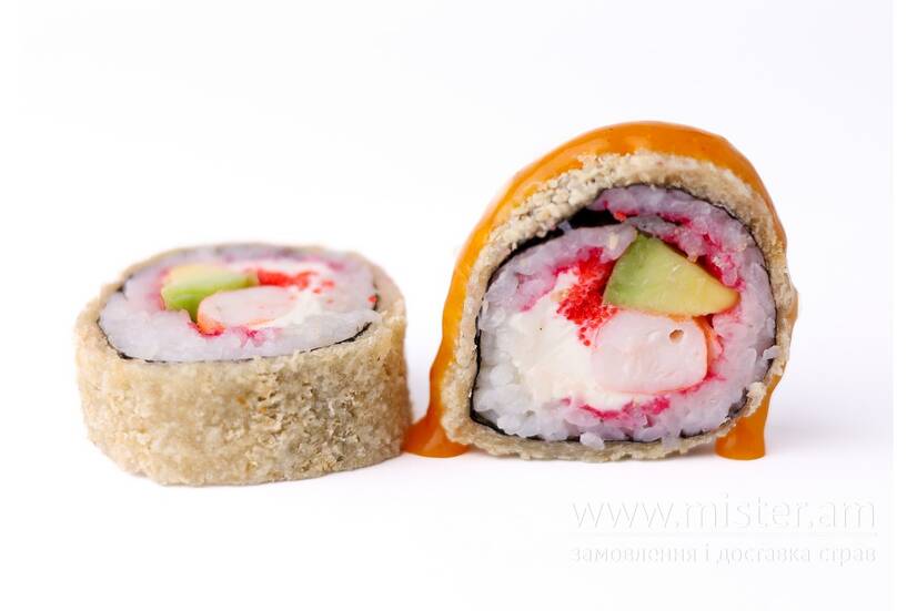 Суші-рис, норі, вершковий крем-сир, креветки тигрові, авокадо, ікра тобіко, соус манго, рожева паніровка, темпура.