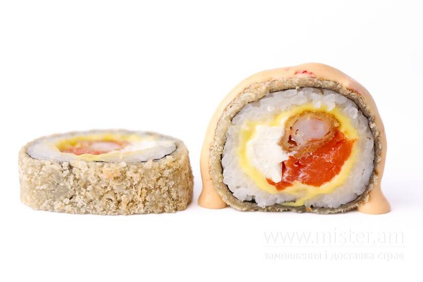 Суші-рис, норі, вершковий крем-сир, лосось, тигрова креветка в паніровці, сир чеддер, соус спайс, темпура.