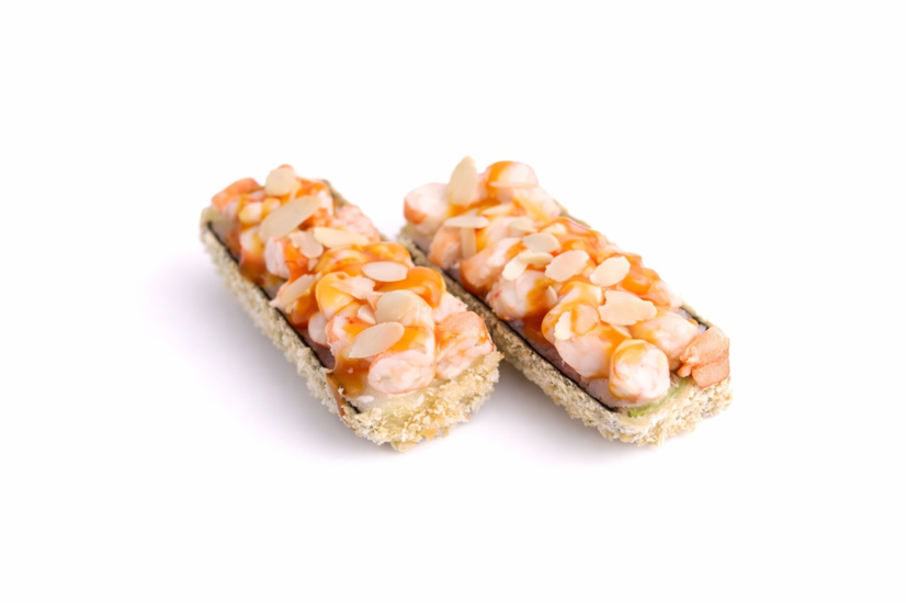 Суші-рис, норі, вершковий крем-сир, креветки, авокадо, соус манго, мигдаль, темпура.