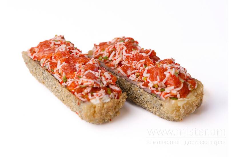 Суші-рис, норі, вершковий крем-сир, лосось, авокадо, соус спайс, крабові палички, темпура.