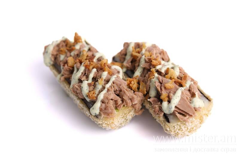 Суші-рис, норі, вершковий крем-сир, авокадо, тунець у власному соку, часниковий соус, цибуля фрі, темпура.