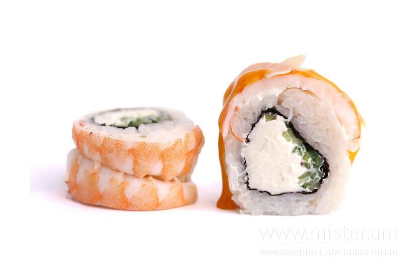 Суші-рис, норі, вершковий крем-сир, огірки, креветки, соус манго, мигдаль.