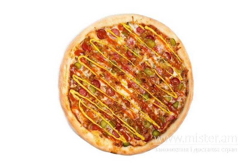Тісто, червоний соус, сир моцарела, мисливські ковбаски, огірки мариновані, соус барбекю, гірчиця, цибуля фрі.
