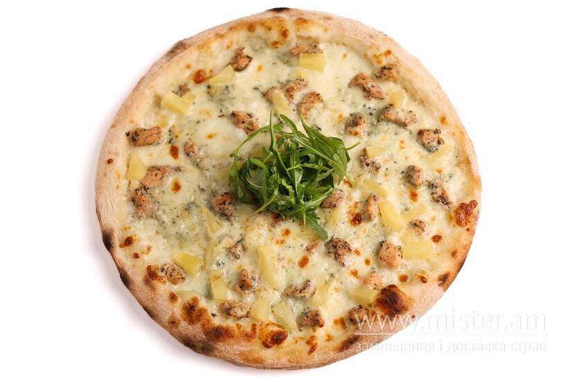 Тісто, білий соус, моцарела, куряче філе, ананас, дорблю, рукола.